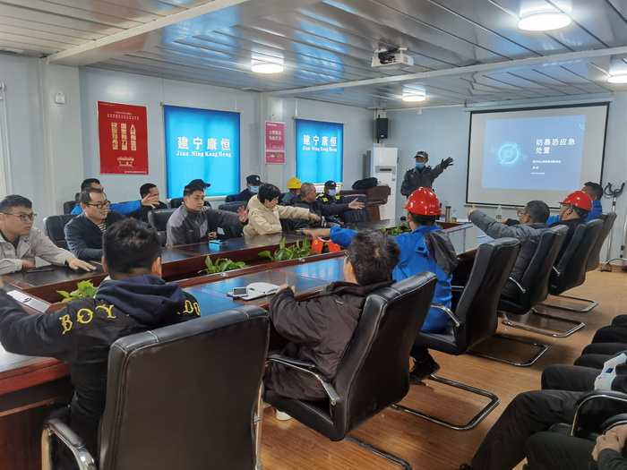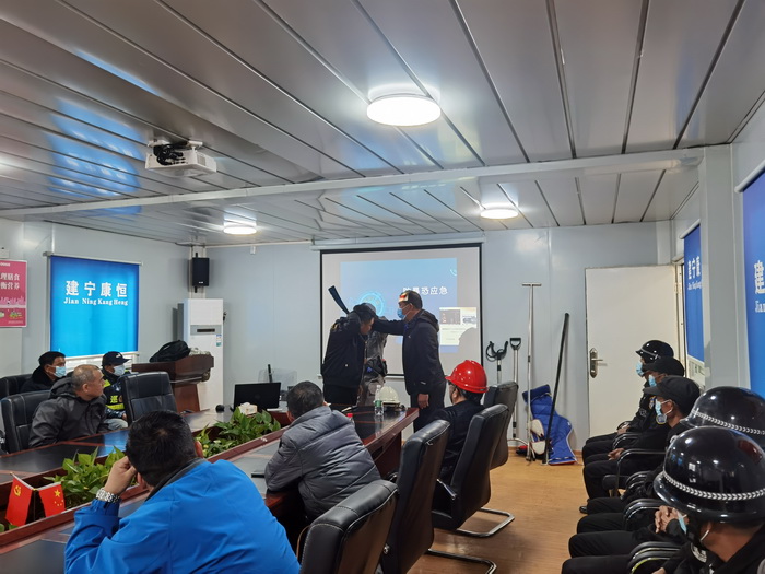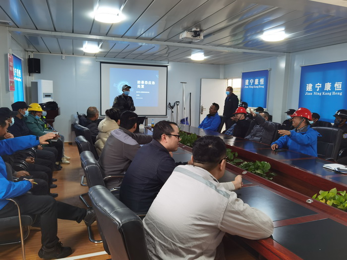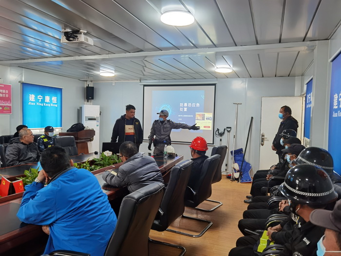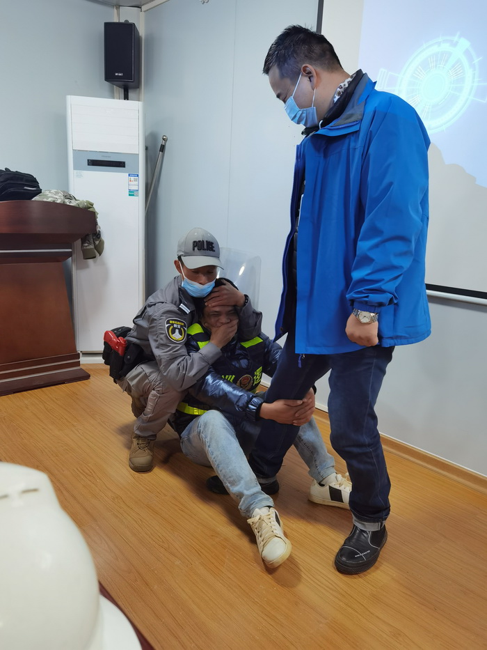应急演练中,由我司队长手持刀具充当“歹徒”。教官按防暴应急预案手持棍棒、钢叉等,将“歹徒”围住,强调要临危不乱,与他交涉、周旋,设法牵制“歹徒”,并指导单人与多人配合应急处置的方法,