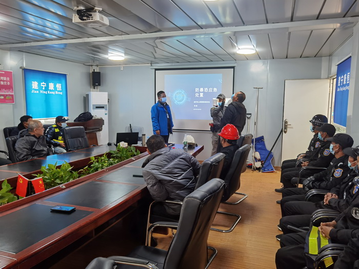 2021年12月28日下午,在双定循环产业园区开展模拟反恐防暴演练,教官以“公安机关处警角度”出发,结合实际给园区员工及安保人员普及安全意识及应急处置方法。
