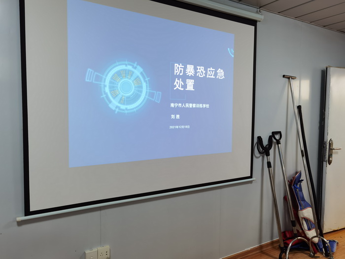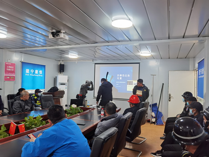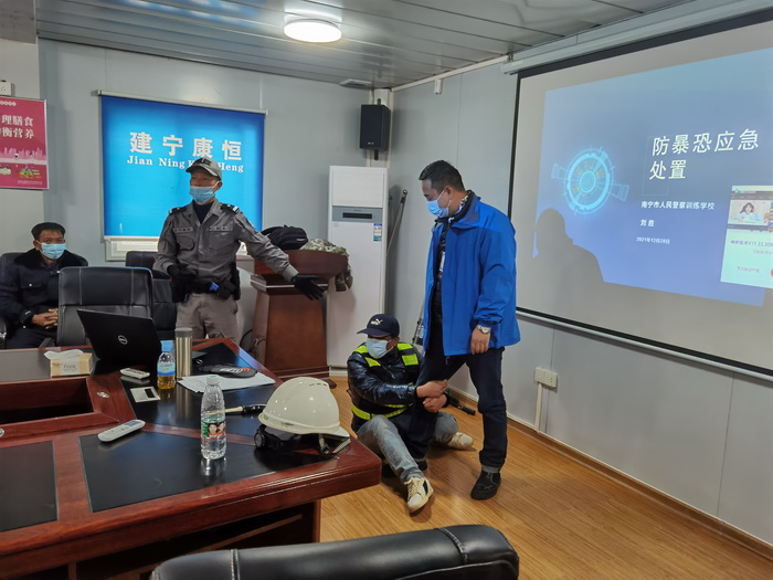 2021年12月28日下午,在双定循环产业园区开展模拟反恐防暴演练,教官以“公安机关处警角度”出发,结合实际给园区员工及安保人员普及安全意识及应急处置方法。
