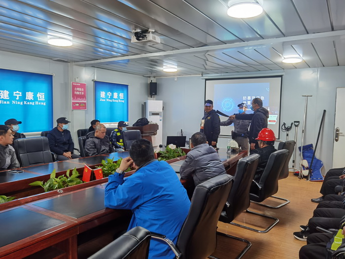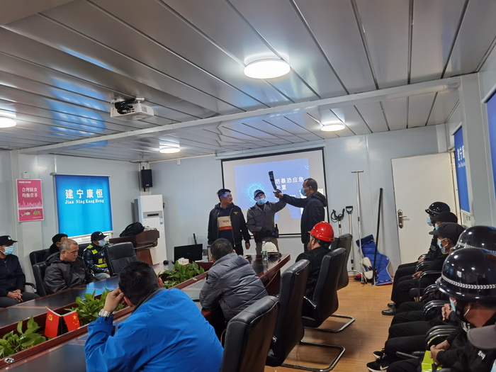 应急演练中,由我司队长手持刀具充当“歹徒”。教官按防暴应急预案手持棍棒、钢叉等,将“歹徒”围住,强调要临危不乱,与他交涉、周旋,设法牵制“歹徒”,并指导单人与多人配合应急处置的方法,